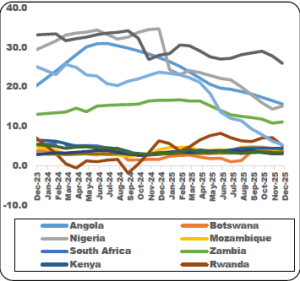 Headline inflation eased for the second consecutive month, falling to 26.0 percent in December 2025 from 27.9 percent in November 2025, largely on account of a sharp moderation in food inflation. Non‑food inflation, however, edged up to 25.2 percent from 24.2 percent, mainly reflecting the increase in fuel prices effected in October 2025. Meanwhile, inflation averaged 28.4 percent in 2025, down from 32.2 percent in 2024.